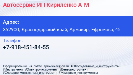 Автосервис, ИП Кириленко А.М. по адресу 352900, Краснодарский край, Армавир, Ефремова, 45 в дальнейшем Организация, размещена в следующих категориях:
