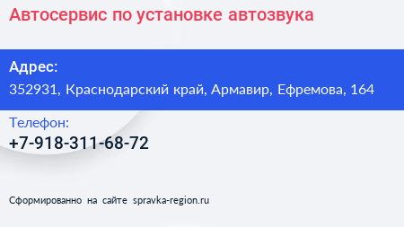 Автосервис по установке автозвука по адресу 352931, Краснодарский край, Армавир, Ефремова, 164 в дальнейшем Организация, размещена в следующих категориях:
