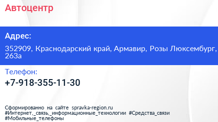 Автоцентр по адресу 352909, Краснодарский край, Армавир, Розы Люксембург, 263а в дальнейшем Организация, размещена в следующих категориях: