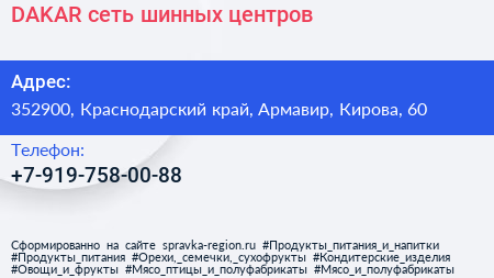 DAKAR, сеть шинных центров по адресу 352900, Краснодарский край, Армавир, Кирова, 60 в дальнейшем Организация, размещена в следующих категориях:
