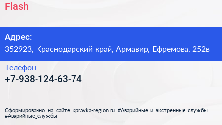 Flash по адресу 352923, Краснодарский край, Армавир, Ефремова, 252в в дальнейшем Организация, размещена в следующих категориях: