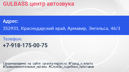 GULBASS, центр автозвука по адресу 352931, Краснодарский край, Армавир, Энгельса, 46/1 в дальнейшем Организация, размещена в следующих категориях: