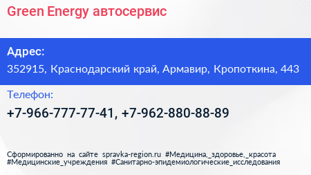 Green Energy, автосервис по адресу 352915, Краснодарский край, Армавир, Кропоткина, 443 в дальнейшем Организация, размещена в следующих категориях: