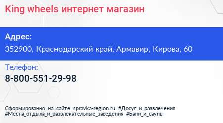 King-wheels, интернет-магазин по адресу 352900, Краснодарский край, Армавир, Кирова, 60 в дальнейшем Организация, размещена в следующих категориях:
