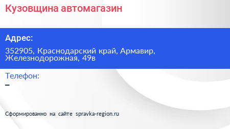 Кузовщина, автомагазин по адресу 352905, Краснодарский край, Армавир, Железнодорожная, 49в в дальнейшем Организация, размещена в следующих категориях: