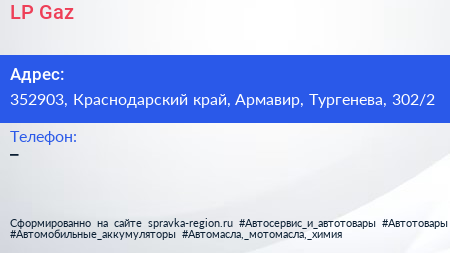 LP-Gaz по адресу 352903, Краснодарский край, Армавир, Тургенева, 302/2 в дальнейшем Организация, размещена в следующих категориях: