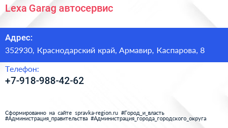 Lexa-Garag, автосервис по адресу 352930, Краснодарский край, Армавир, Каспарова, 8 в дальнейшем Организация, размещена в следующих категориях: