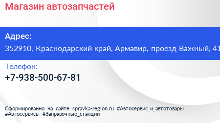 Магазин автозапчастей по адресу 352910, Краснодарский край, Армавир, проезд Важный, 41 в дальнейшем Организация, размещена в следующих категориях: