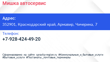 Мишка, автосервис по адресу 352901, Краснодарский край, Армавир, Чичерина, 7 в дальнейшем Организация, размещена в следующих категориях: