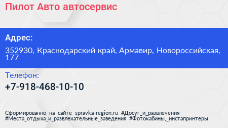 Пилот-Авто, автосервис по адресу 352930, Краснодарский край, Армавир, Новороссийская, 177 в дальнейшем Организация, размещена в следующих категориях: