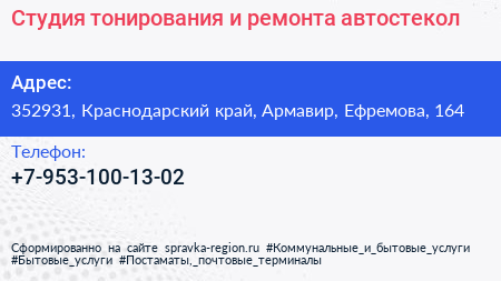 Студия тонирования и ремонта автостекол по адресу 352931, Краснодарский край, Армавир, Ефремова, 164 в дальнейшем Организация, размещена в следующих категориях: