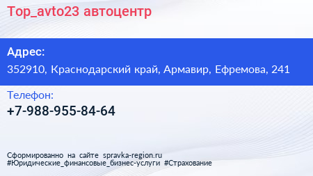 Top_avto23, автоцентр по адресу 352910, Краснодарский край, Армавир, Ефремова, 241 в дальнейшем Организация, размещена в следующих категориях: