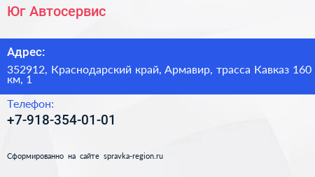 Юг-Автосервис по адресу 352912, Краснодарский край, Армавир, трасса Кавказ 160 км, 1 в дальнейшем Организация, размещена в следующих категориях: