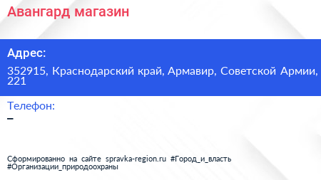Авангард, магазин по адресу 352915, Краснодарский край, Армавир, Советской Армии, 221 в дальнейшем Организация, размещена в следующих категориях: