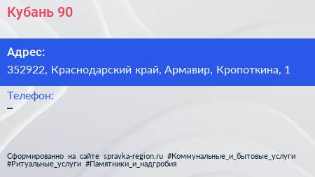 Кубань-90 по адресу 352922, Краснодарский край, Армавир, Кропоткина, 1 в дальнейшем Организация, размещена в следующих категориях: