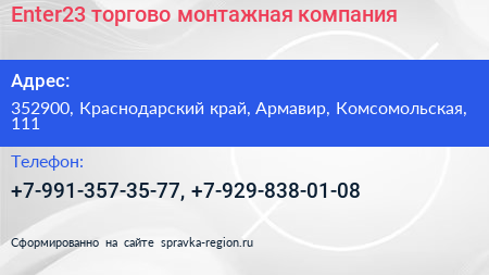 Enter23, торгово-монтажная компания по адресу 352900, Краснодарский край, Армавир, Комсомольская, 111 в дальнейшем Организация, размещена в следующих категориях: