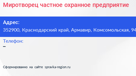Миротворец, частное охранное предприятие по адресу 352900, Краснодарский край, Армавир, Комсомольская, 94 в дальнейшем Организация, размещена в следующих категориях: