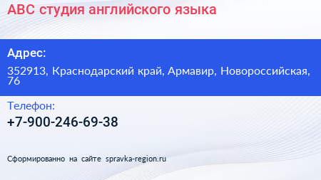 ABC, студия английского языка по адресу 352913, Краснодарский край, Армавир, Новороссийская, 76 в дальнейшем Организация, размещена в следующих категориях: