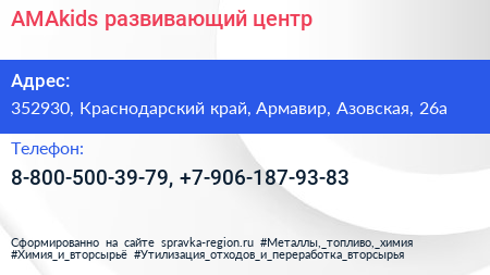 AMAkids, развивающий центр по адресу 352930, Краснодарский край, Армавир, Азовская, 26а в дальнейшем Организация, размещена в следующих категориях: