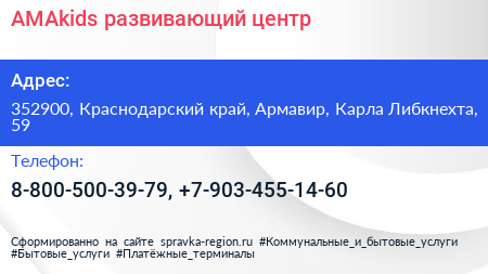 AMAkids, развивающий центр по адресу 352900, Краснодарский край, Армавир, Карла Либкнехта, 59 в дальнейшем Организация, размещена в следующих категориях: