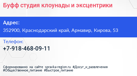 Буфф, студия клоунады и эксцентрики по адресу 352900, Краснодарский край, Армавир, Кирова, 53 в дальнейшем Организация, размещена в следующих категориях:
