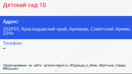 Детский сад №10 по адресу 352915, Краснодарский край, Армавир, Советской Армии, 224а в дальнейшем Организация, размещена в следующих категориях: