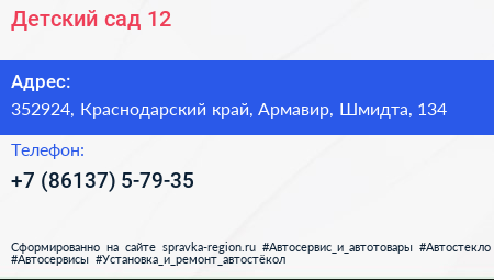 Детский сад №12 по адресу 352924, Краснодарский край, Армавир, Шмидта, 134 в дальнейшем Организация, размещена в следующих категориях: