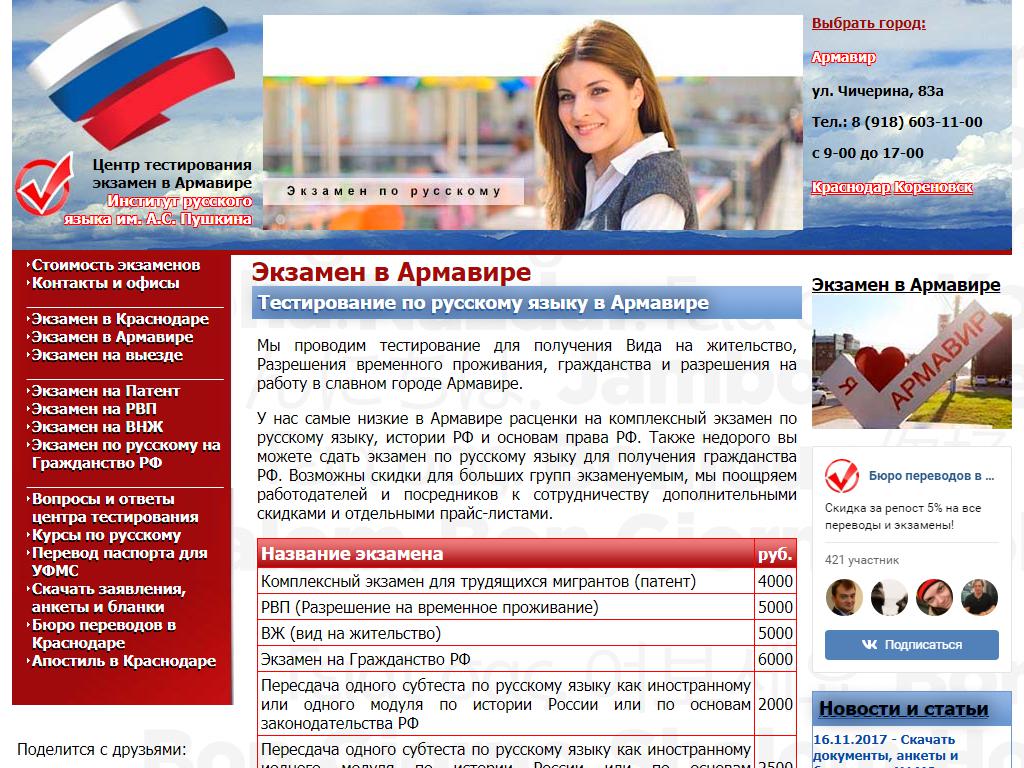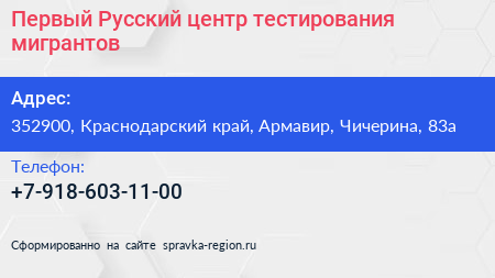 Первый Русский, центр тестирования мигрантов по адресу 352900, Краснодарский край, Армавир, Чичерина, 83а в дальнейшем Организация, размещена в следующих категориях: