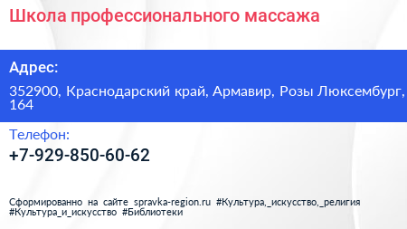 Школа профессионального массажа по адресу 352900, Краснодарский край, Армавир, Розы Люксембург, 164 в дальнейшем Организация, размещена в следующих категориях: