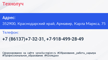 Технолуч+ по адресу 352900, Краснодарский край, Армавир, Карла Маркса, 75 в дальнейшем Организация, размещена в следующих категориях: