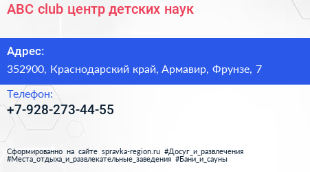 ABC club, центр детских наук по адресу 352900, Краснодарский край, Армавир, Фрунзе, 7 в дальнейшем Организация, размещена в следующих категориях: