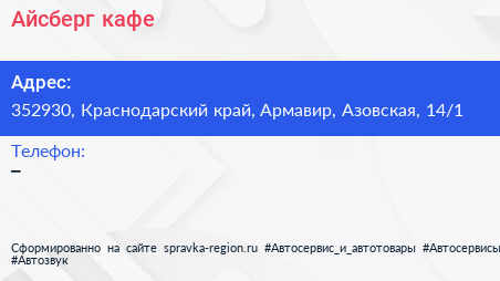 Айсберг, кафе по адресу 352930, Краснодарский край, Армавир, Азовская, 14/1 в дальнейшем Организация, размещена в следующих категориях: