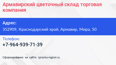 Армавирский цветочный склад, торговая компания по адресу 352909, Краснодарский край, Армавир, Мира, 50 в дальнейшем Организация, размещена в следующих категориях: