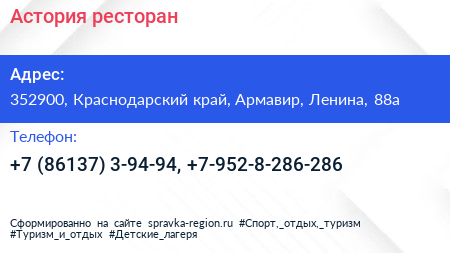 Астория, ресторан по адресу 352900, Краснодарский край, Армавир, Ленина, 88а в дальнейшем Организация, размещена в следующих категориях: