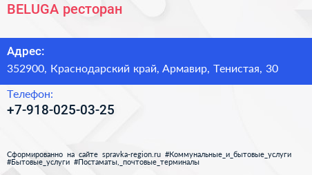 BELUGA, ресторан по адресу 352900, Краснодарский край, Армавир, Тенистая, 30 в дальнейшем Организация, размещена в следующих категориях: