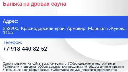 Банька на дровах, сауна по адресу 352900, Краснодарский край, Армавир, Маршала Жукова, 115а в дальнейшем Организация, размещена в следующих категориях: