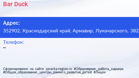 Bar Duck по адресу 352902, Краснодарский край, Армавир, Луначарского, 382 в дальнейшем Организация, размещена в следующих категориях: