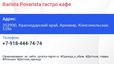 Barista & Povarista, гастро-кафе по адресу 352900, Краснодарский край, Армавир, Комсомольская, 118а в дальнейшем Организация, размещена в следующих категориях: