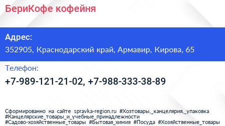 #БериКофе, кофейня по адресу 352905, Краснодарский край, Армавир, Кирова, 65 в дальнейшем Организация, размещена в следующих категориях: