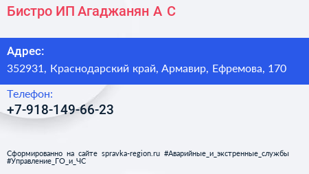 Бистро, ИП Агаджанян А.С. по адресу 352931, Краснодарский край, Армавир, Ефремова, 170 в дальнейшем Организация, размещена в следующих категориях: