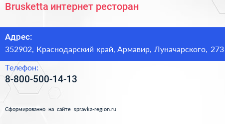 Brusketta, интернет-ресторан по адресу 352902, Краснодарский край, Армавир, Луначарского, 273 в дальнейшем Организация, размещена в следующих категориях: