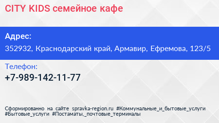 CITY KIDS, семейное кафе по адресу 352932, Краснодарский край, Армавир, Ефремова, 123/5 в дальнейшем Организация, размещена в следующих категориях: