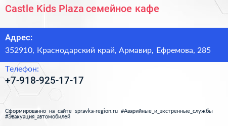 Castle Kids Plaza, семейное кафе по адресу 352910, Краснодарский край, Армавир, Ефремова, 285 в дальнейшем Организация, размещена в следующих категориях: