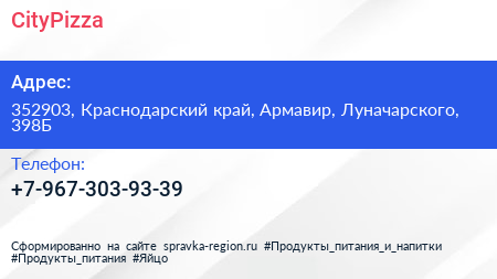 CityPizza по адресу 352903, Краснодарский край, Армавир, Луначарского, 398Б в дальнейшем Организация, размещена в следующих категориях: