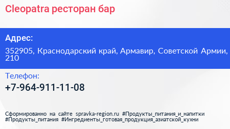 Cleopatra, ресторан-бар по адресу 352905, Краснодарский край, Армавир, Советской Армии, 210 в дальнейшем Организация, размещена в следующих категориях: