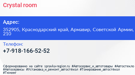 Crystal room по адресу 352905, Краснодарский край, Армавир, Советской Армии, 210 в дальнейшем Организация, размещена в следующих категориях: