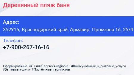 Деревянный пляж, баня по адресу 352916, Краснодарский край, Армавир, Промзона 16, 25/4 в дальнейшем Организация, размещена в следующих категориях: