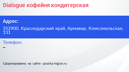 Dialogue, кофейня-кондитерская по адресу 352900, Краснодарский край, Армавир, Комсомольская, 131 в дальнейшем Организация, размещена в следующих категориях: