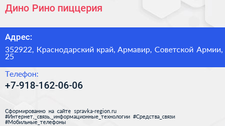 Дино Рино, пиццерия по адресу 352922, Краснодарский край, Армавир, Советской Армии, 25 в дальнейшем Организация, размещена в следующих категориях: