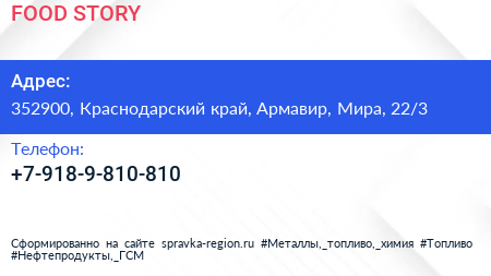 FOOD STORY по адресу 352900, Краснодарский край, Армавир, Мира, 22/3 в дальнейшем Организация, размещена в следующих категориях: